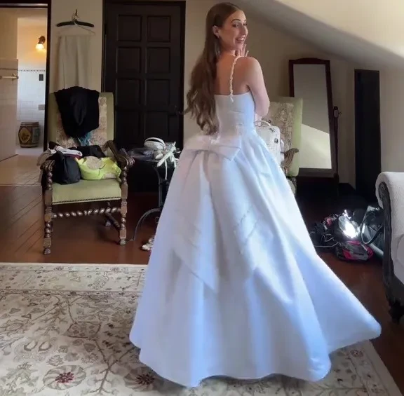 „Som taká nadšená, že som objavila tieto jednoduché svadobné šaty. Sadli mi ako uliate,” pochvaľuje si Julia, ktorá bola nadšená z toho, že ušetrila poriadnu kopu peňazí. Vo videu ich ukázala aj zozadu, kde ich zdobí veľká masívna mašľa.