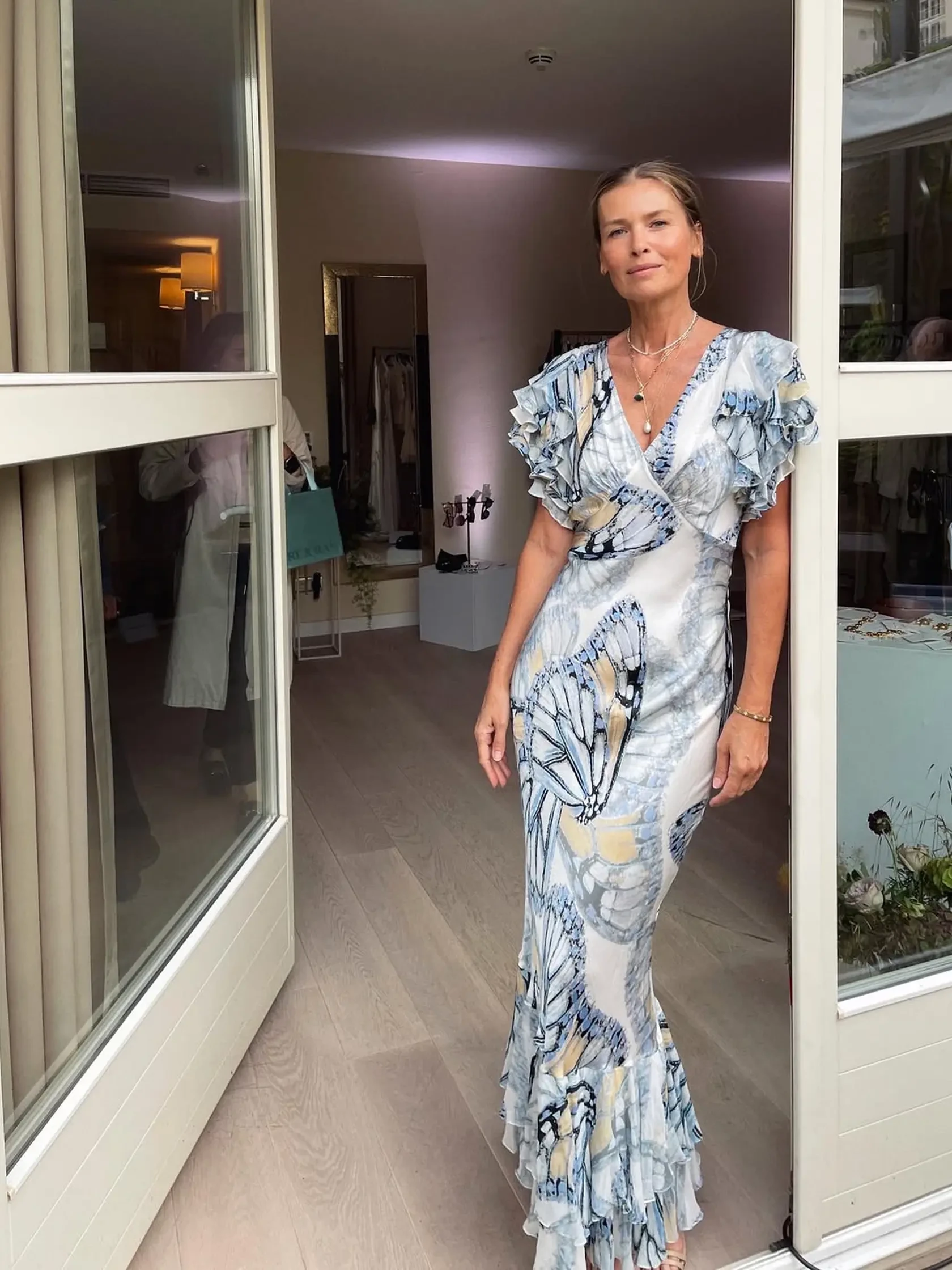 Modelka prekvapila a na wellness dňoch magazínu Harpers Bazaar sa objavila v krémových maxišatách s modrou potlačou motýľov, ktoré skombinovala s trendy rifľovou bundičkou.