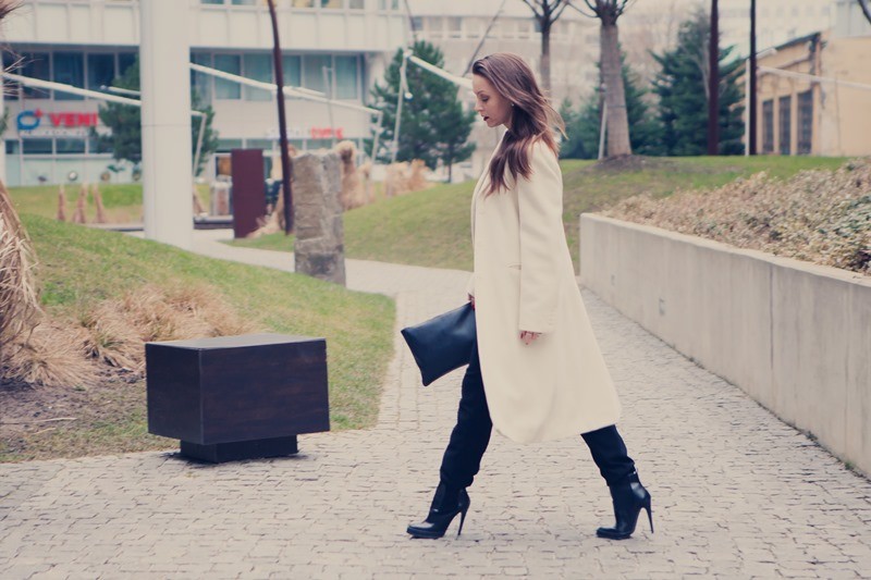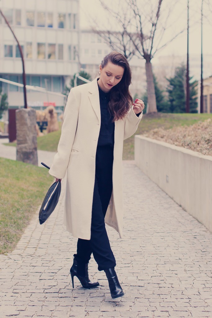 Čiernu farbu som zjemnila bielym oversized kabátom. Jemná bižutéria – zlaté náušnice s perličkami, jednoduché hodinky a tmavý rúž dodali ten správny ženský akcent. Menšia čierna kabelka do ruky je už len samozrejmosťou, ktorá nemôže chýbať.
