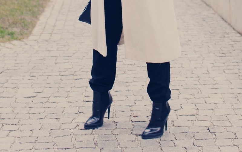 Tento outfit je poskladaný zo zvláštnych, pre niekoho možno nie práve typicky zladených kúskov. Základom sú ležérne nohavice, ktoré pripomínajú tepláky (a väčšina by si ich obliekla práve s tričkom a teniskami). Tie som skombinovala s členkovými čižmami na vysokom podpätku a elegantnou čiernou košeľou z padavého materiálu.