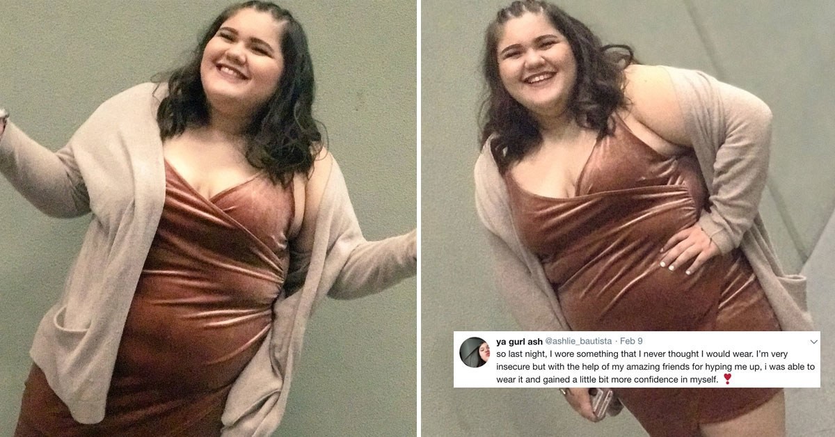 “Obliekla som si tieto šaty, o ktorých som si myslela, že si ich nikdy neoblečiem. Cítim sa veľmi neisto, ale ďakujem mojim priateľom, ktorí mi pomohli získať väčšie sebavedomie…” napísala k fotografiám Ashlie a netušila, že jej príspevok sa stane zo dňa na deň virálny.