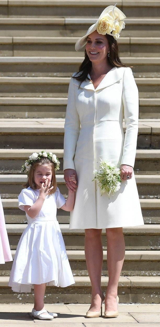 Kate sa v minulosti priznala, že práve biela farba patrí k jej najobľúbenejším a musíme uznať, že jej naozaj mimoriadne pristane. Vojvodkyňa z Cambridge si obliekla na svadbu Meghan a Harryho kabát z dielne Alexander McQueen, odkiaľ pochádzali aj jej krásne svadobné šaty. Outfit doplnila výrazným klobúkom od Philipa Treacyho a obula si taktiež obľúbené lodičky Jimmy Choo.