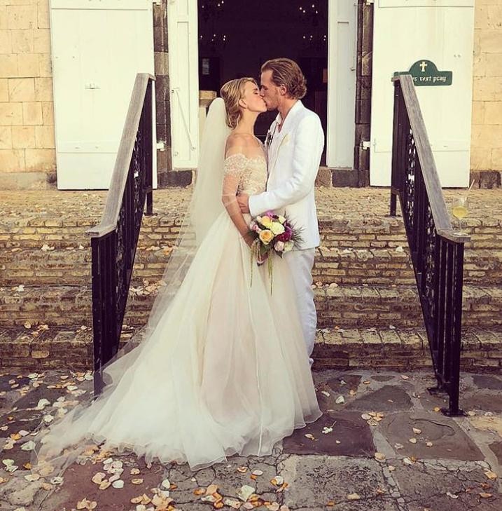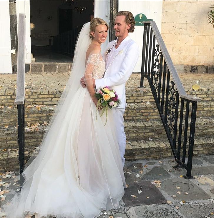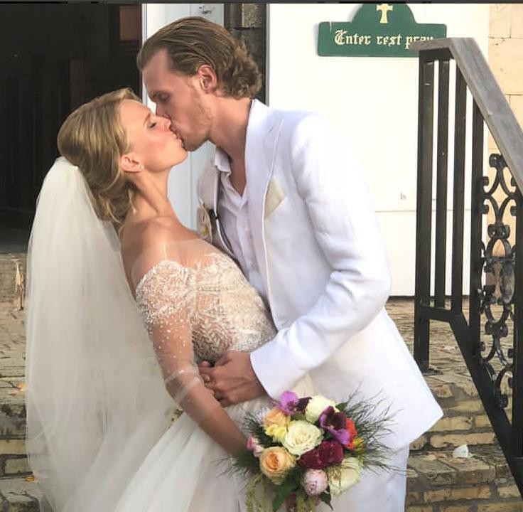 Štíhla blondína si zvolila rozprávkové šaty, ktoré prítomným hosťom vyrazili dych! Vrchnú časť tvorila rafinovaná výšivka, ktorá vpredu zakrývala všetko, čo mala a vzadu vďaka véčkovému výstrihu odhalila takmer celý chrbát. Bohatá sukňa až po zem navodila efekt princeznovských šiat. Tie pochádzajú z dielne Vatany Watters, Samozrejme, nechýbal ani dlhý závoj a netradične – farebná kytica.