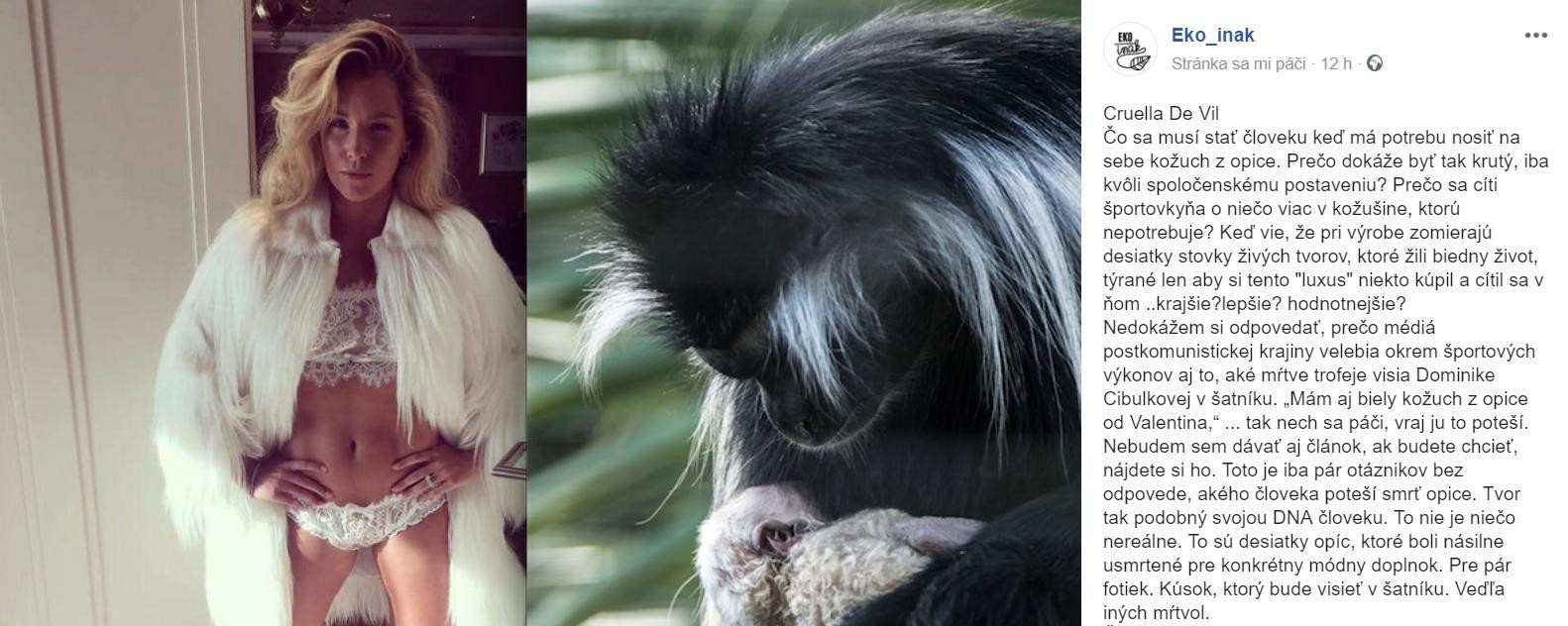 Nič zvláštne by na tom nebolo, ak by sa jednej z našich najlepších tenistiek nepáčili práve luxusné vecičky vyrobené z exotických koží a kožušín zvierat. V rozhovore pre časopis Šarm sa nedávno pochválila, že je hrdá majiteľka kožúška z bielej opice. To si všimli aj z blogu eko_inak, ktorí sa snažia verejnosť nenásilne vzdelávať a ukazovať cestu, ako žiť v harmónii s prírodou „Čo sa musí stať človeku, keď má potrebu nosiť na sebe kožuch z opice. Prečo dokáže byť tak krutý, iba kvôli spoločenskému postaveniu? Prečo sa cíti športovkyňa o niečo viac v kožušine, ktorú nepotrebuje? Keď vie, že pri výrobe zomierajú desiatky stovky živých tvorov, ktoré žili biedny život, týrané len aby si tento "luxus" niekto kúpil a cítil sa v ňom...Krajšie? Lepšie? Hodnotnejšie? Nedokážem si odpovedať, prečo médiá postkomunistickej krajiny velebia okrem športových výkonov aj to, aké mŕtve trofeje visia Dominike Cibulkovej v šatníku,“ píše sa v príspevku, ktorý aktuálne zdieľajú stovky Slovákov.