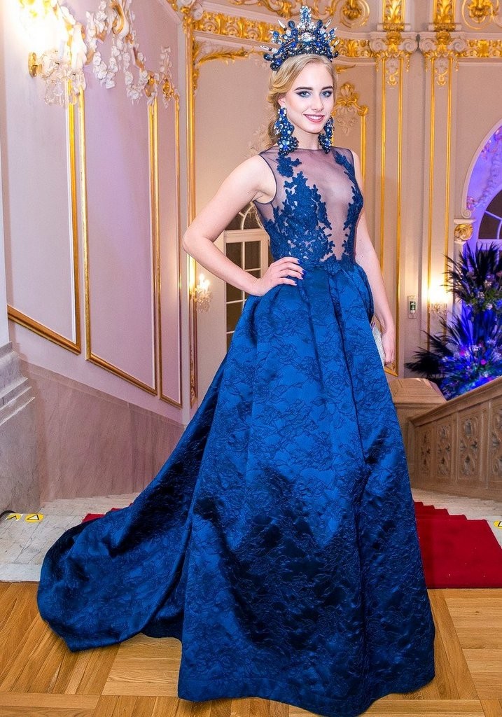 Po nádherných svetlomodrých šatách, ktoré predviedla na Plese v opere, tentoraz siahla po tmavomodrých šatách s hlbokým výstrihom od návrhárky Jany Jurčenko, ktoré perfektne dopĺňali výrazné náušnice a modrý diadém na hlave.