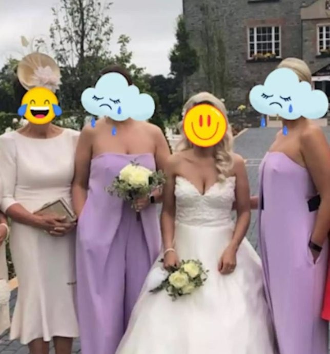 Po oboch stranách nevesty stoja jej družičky, ktorým outfity vybrala práve nevesta. Vôbec by nevadilo, že ide o overaly bez ramienok, ktoré sú aj na svadbách veľmi populárne, v poriadku je aj pastelová fialová farba. Čo však ľuďom okamžite udrelo do očí je nešťastný strih, ktorý im pripomínal ženskú vagínu. Celkový dojem ešte „zaklincovali“ bradavky družičiek, ktoré sa pod látkou overalu nedali prehliadnuť.
