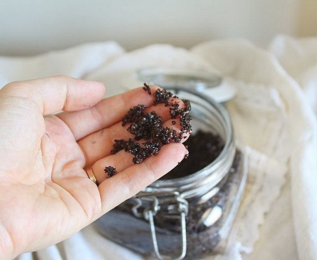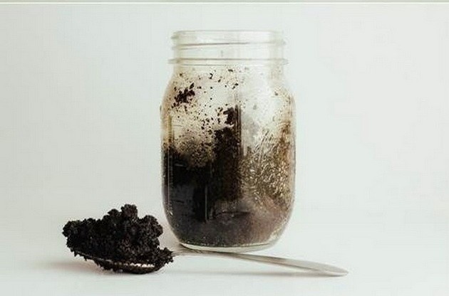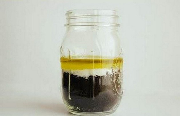 1. Do menšej uzatvárateľnej nádobky nasypte do polovice mletú kávu, pridajte 2-3 lyžičky sódy bikarbóny a nalejte trochu olivového oleja.