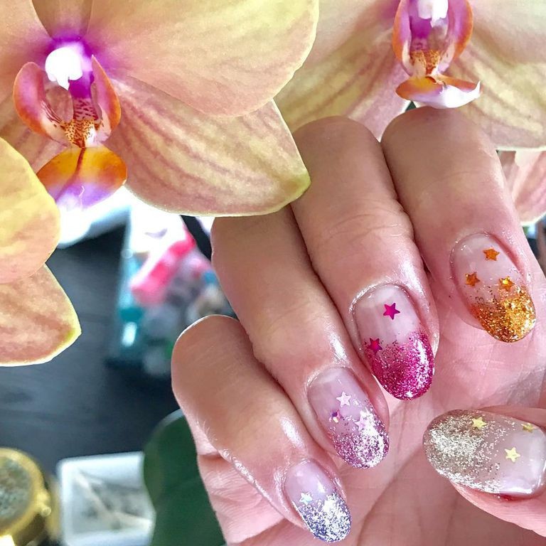 Trblietky a rôzne farebné glitre sú veľkým trendom v mejkape a rovnako aj v manikúre. Kombinujte trblietavé laky s drobnými nálepkami, pokojne môžete mať každý necht inej farby.