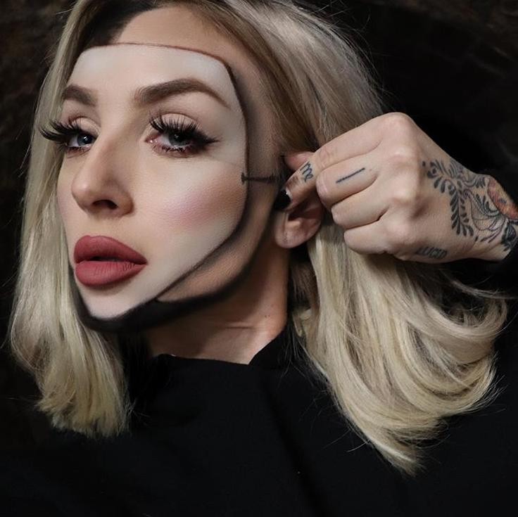 Dôkazom je aj mejkap, ktorý vytvorila na vlastnej tvári. Pomocou líčidiel si na tvári pomyslene vytvorila masku, pritom ide len o hru s tieňmi. Aj keď to na prvý pohľad vyzerá, akoby mala na sebe masku, omyl! Je to len jej tvár. Takto perfektnú prácu, ktorá je hotovým umeleckým dielom, veru nevidieť každý deň.