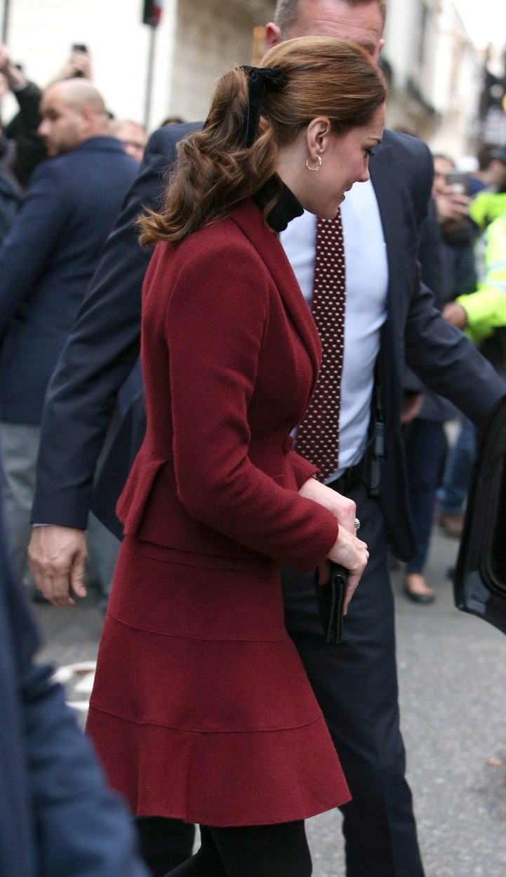 Kate si svoj vrkoč ozdobila čiernou zamatovou stružkou, ktorú uviazala do mašle. Hoci sa mašle rôznych typov objavili v kolekciách viacerých módnych návrhárov, vojvodkyňa stavila na decentnú klasiku. Zamatová mašľa vo vlasoch je ideálna ako vlasový doplnok na rôzne spoločenské udalosti, aj k štedrovečernému stolu.