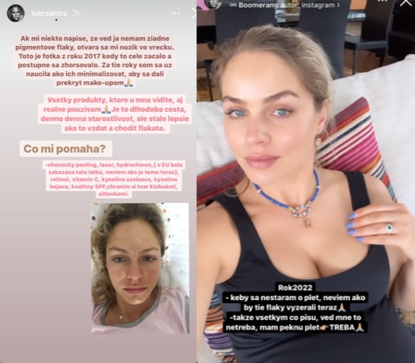 Čo jej najviac pomohlo? Chemický píling, laser, hydrochinón, retinol, vitamín C, kyselina azelaová, kyselina kojová, kvalitný SPF. "Všetky produkty, ktoré u mňa vidíte, aj reálne používam. Je to dlhodobá cesta, denno-denná starostlivosť, ale stále lepšie, ako to vzdať a chodiť fľakatá," dodala Ivana.