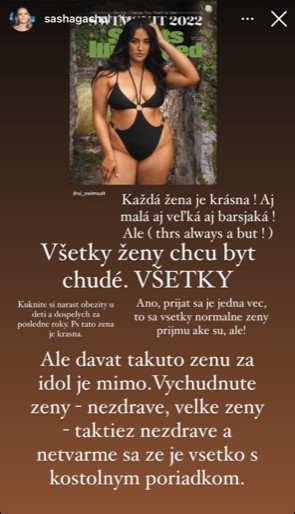 Pred pár rokmi sa na titulku dostala Ashley Graham ako prvá plus size modelka a odvtedy sa tu vystriedalo pár promi žien, ktoré rozhodne nie sú typickými modelkami. Aktuálne vydanie spomínaného čísla prinieslo dokonca hneď štyri ženy - speváčku Ciaru, Kim Kardashian, matku Elona Muska, Maye a americkú modelku a speváčku Yumi Nu. Pri pohľade na spomínané ženy je asi každému jasné, že nejde o zaužívané prototypy krásy a zdravého životného štýlu. A to skritizovala aj slovenská topmodelka Alexandra Gachulincová. "Kedysi tam boli športovkyne s vymakanými telami a krásne ženy. A teraz?! ...dávať tam babky 70-ročné, lebo je to Muskova mama, je pre mňa dosť mimo," vyjadrila svoj názor kráska, ktorá nešetrila ani Kim Kardashian: "Neviem ani čo tam robí táto. Plastická kráľovná s tak nezdravým telom..."