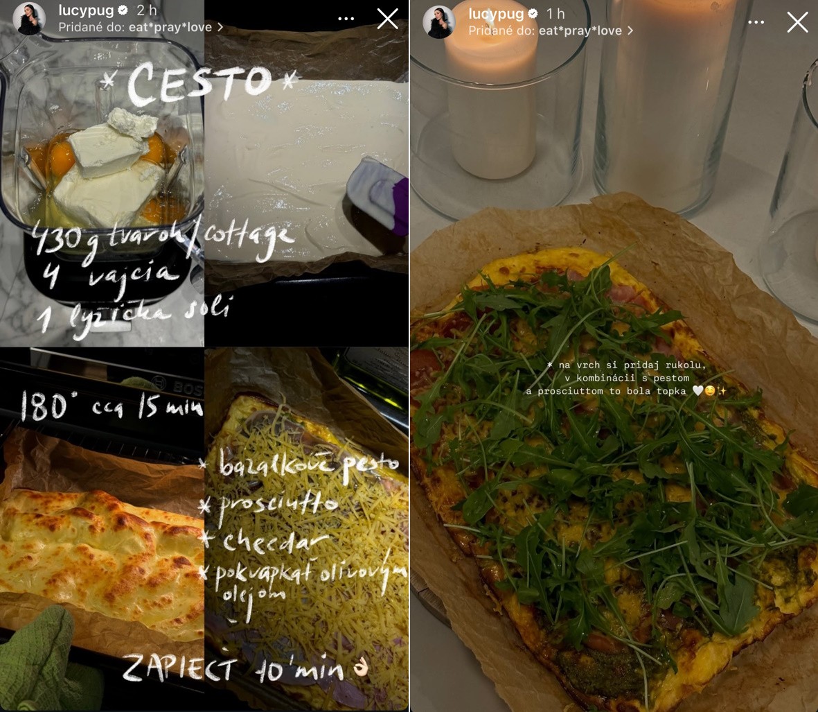 Hoci väčšia zdravších variácií pizze obsahuje ovsené vločky, táto ani to nie! Základ tvorí iba tvaroh s vajíčkami. Takto upečené cesto môžete, samozrejme ozdobiť hocičím, na čo máte chuť. Populárna influencerka Lucy Pug zvolila pesto s proscuittom. "Na vrch si pridaj rukolu, v kombinácii s pestom a proscuittom to bola topka," priznala Lucy. Je už len na vás, akú oblohu si zvolíte. Isté je, že si na nej môžete pochutnať aj na večeru a to bez výčitiek!