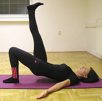 Základná poloha: ľah na chrbte, panva vyrolovaná do rovného trupu, maximálne po špičky lopatiek, ruky sú od tela v 45 stupňovom uhle, na chrbte dlaní, za prsty nás ťahajú do diaľky, krížová a lonová kosť sa ťahajú do diaľky, vtiahneme svaly panvového dna, hlava je vo vytiahnutí do diaľky, ramená a kľúčne kosti sa ťahajú do strán, rebrá ťaháme dole k panve, zdvihneme pravú nohu kolmo nad podložku, nadýchneme sa