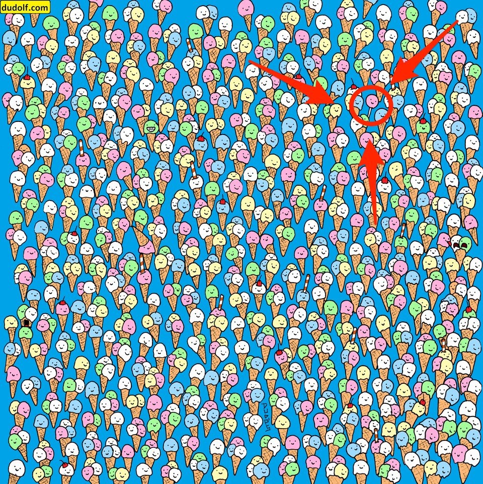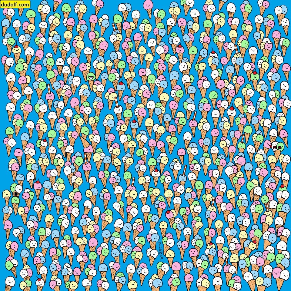 Dobre si prezrite tento obrázok. Na prvý pohľad je zaplnený kornútkami so zmrzlinou, ale je medzi nimi aj jedno lízatko ružovej farby. Našli ste ho hneď?