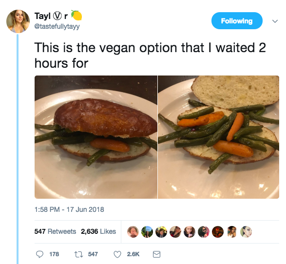 “Všetci dostali taniere plné jedla a keď už dávno dojedli, priniesli moju vegánsku objednávku,” hovorí Taylor, ktorá si na “zdravú” špecialitu počkala takmer dve hodiny. Keď uvidela, čo jej nakoniec priniesli, zostala doslova v šoku!