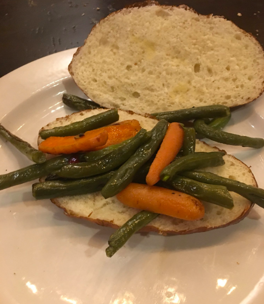 Lahodnú zeleninu vo vegánskej žemli si takto rozhodne nepredstavovala! Namiesto toho dostala suché pečivo, zopár uvarených zelených fazulí a pár baby mrkvičiek….