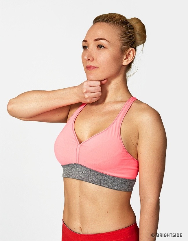 Zatnite ruku v päsť a tlačte ju smerom k brade. Vydržte 5 sekúnd a potom na 5 sekúnd uvoľnite. Opakujte 2-3 krát.