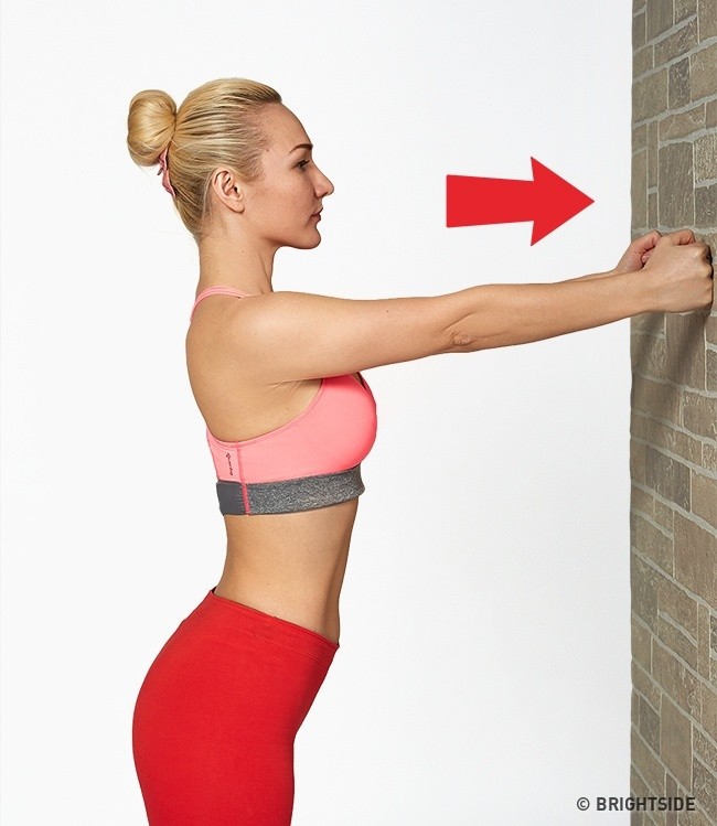 Postavte sa pol metra od steny, roztiahnite si ruky pred sebou a začnite na stenu tlačiť päsťami. Tlačte 20 sekúnd, potom odpočívajte 10 sekúnd. Opakujte 3-krát.