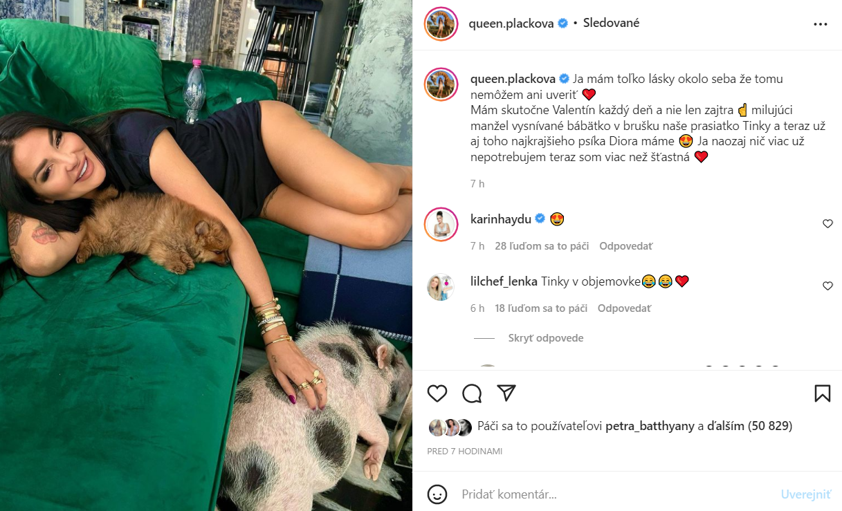 Aj to sa im po dlhom snaží nakoniec podarilo a teraz si už len vychutnávajú život. A hoci Zuzana vyhlásila, že jej už v živote nič netreba a má naozaj všetko, bola tu ešte jedna vec, po ktorej jej srdce pišťalo. René ju prekvapil rozkošným šteniatkom, ktoré jej daroval práve na Valentína. A budúcu mamičku to naozaj dojalo k slzám. "Ja mám toľko lásky okolo seba, že tomu nemôžem ani uveriť. Mám skutočne Valentín každý deň a nie len zajtra - milujúci manžel, vysnívané bábätko v brušku, naše prasiatko Tinky a teraz už aj toho najkrajšieho psíka Diora máme. Ja naozaj nič viac už nepotrebujem, teraz som viac než šťastná," priznala Zuzana.