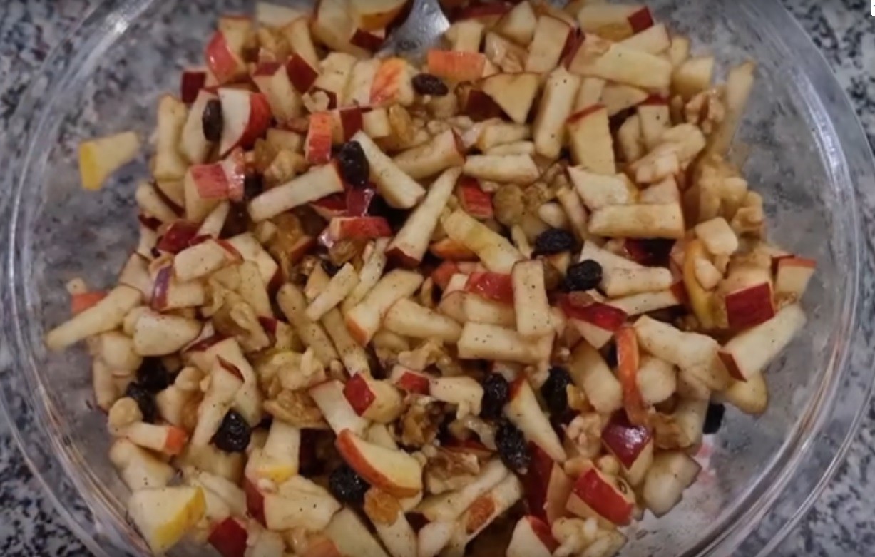 - Jablká pokvapkajte citrónovou šťavou, pridajte trochu vody, premiešajte a postupne pridajte všetky ostatné suroviny.