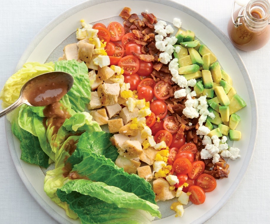 - Šalát pripravíte naservírovaním každej suroviny na tanier v radoch: rímsky a bostonský šalát, kura, vajce, cherry paradajky, nakrájaná slanina, chèvre a nakrájané avokádo. Ozdobte pažítkou (ak chcete), polejte dresingom a vychutnávajte! Zvyšok dresingu skladujte v chladničke vo vzduchotesnej nádobe max. 1 týždeň.