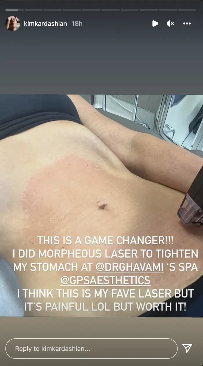 Kim nedávno podstúpila procedúru spevnenia kože na bruchu, ktorá zahŕňala ihlový laser, píše insider.com. S fanúšikmi sa podelila aj o fotku začervenaného bruška. „Povedala by som, že je to môj obľúbený laser, ale bolí to,“ popísala ju a dodala, že tá bolesť rozhodne stojí za to!