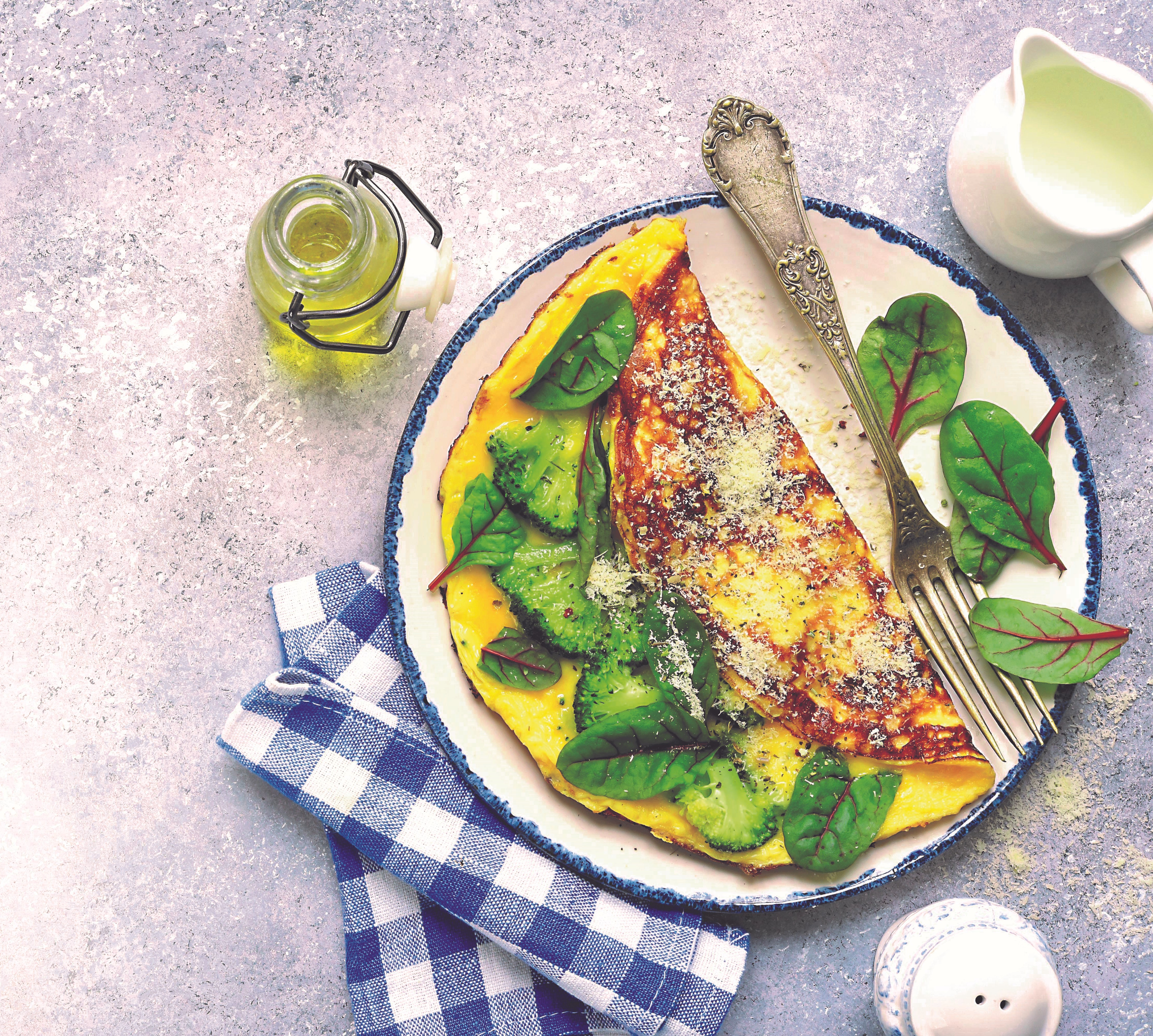 - Večera: Vaječná omeleta s duseným čerstvým špenátom a kúskami syra