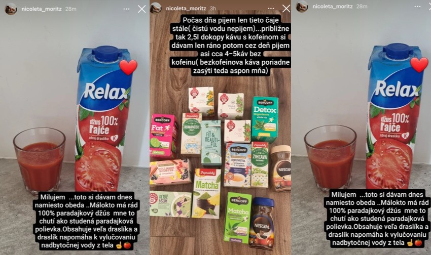 Vnadná bruneta ukázala aj svoj jedálniček a pitný režim. Na raňajky má iba čiernu kávu bez mlieka a cukru a bylinné čaje. "Počas dňa pijem len tieto čaje... približne tak 2,5 l dokopy." Cez deň si dopraje aj 4-5 káv bez kofeínu, ktoré ju zasýtia. Niekedy má na obed iba paradajkový džús, ktorý jej chutí ako polievka. Sú naopak dni, kedy pije iba ovocno-zeleninové smoothie. Dopraje si však aj jedlo, najmä vegánske. Nikolete sa takto za jeden deň podarilo zhodiť už 1,3 kilogramu.