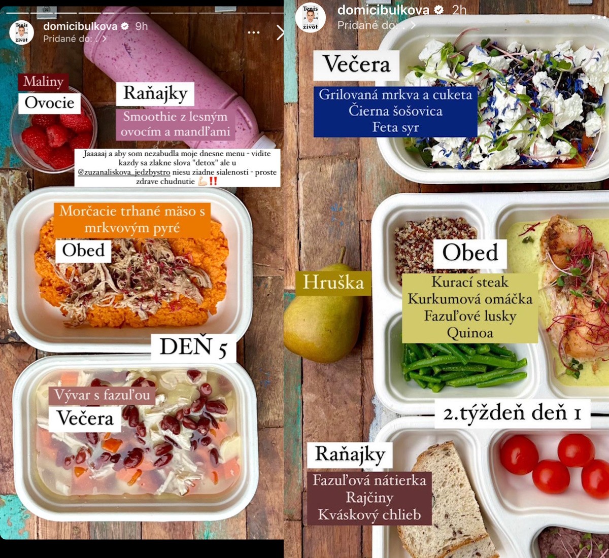 "Jednoducho som si povedala, že chcem ísť na určitú hmotnosť... Idem to robiť motivačne. Bude to motivovať mňa a verím, že to bude motivovať aj niektorých z vás... Už sa aj ja chcem sama sebe páčiť a dobre sa cítiť. Aj keď mi Michal hovorí, že sa mu páčim, robím to hlavne pre seba," priznala blondína. Cibulková bude s verejnosťou zdieľať nielen cvičenia, ale aj svoju stravu. A tá je nielen diétna, ale vyzerá aj veľmi chutne! Dominika je známa tým, že miluje dobré jedlo, ktoré si doteraz neodopierala. Keď sa však už raz podujala stravu zmeniť, tak to aj dodrží! Ako vyzerá jej menu? Prvý týždeň mala detox jedálniček - na raňajky, napríklad, smoothie, ako obed morčacie mäso s mrkvovým pyré a na večeru vývar s fazuľou. Druhý týždeň vyzerá jej jedálniček už pestrejšie. Pochutili by ste si?