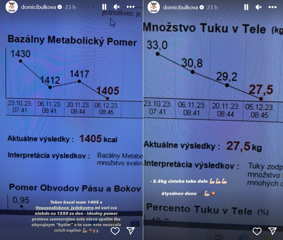 Začala sa zdravo stravovať a od základov zmenila svoj jedálniček. Ten je robia na mieru presne tak, aby pomocou neho chudla. A darí sa jej to naozaj skvele! Dominike sa iba za 6 týždňov podarilo zhodiť neuveriteľných 6,7 kíl dole! Z toho čistého tuku až 5,5 kilogramov! Pritom ešte nezačala cielene cvičiť a hlavným pohybom boli najmä prechádzky..."Ja som, že juchúúúúú...a pokračujeme ďalej. Drobné kardio začínam nahrádzať cvičením vo fitku..." priznala Dominika.