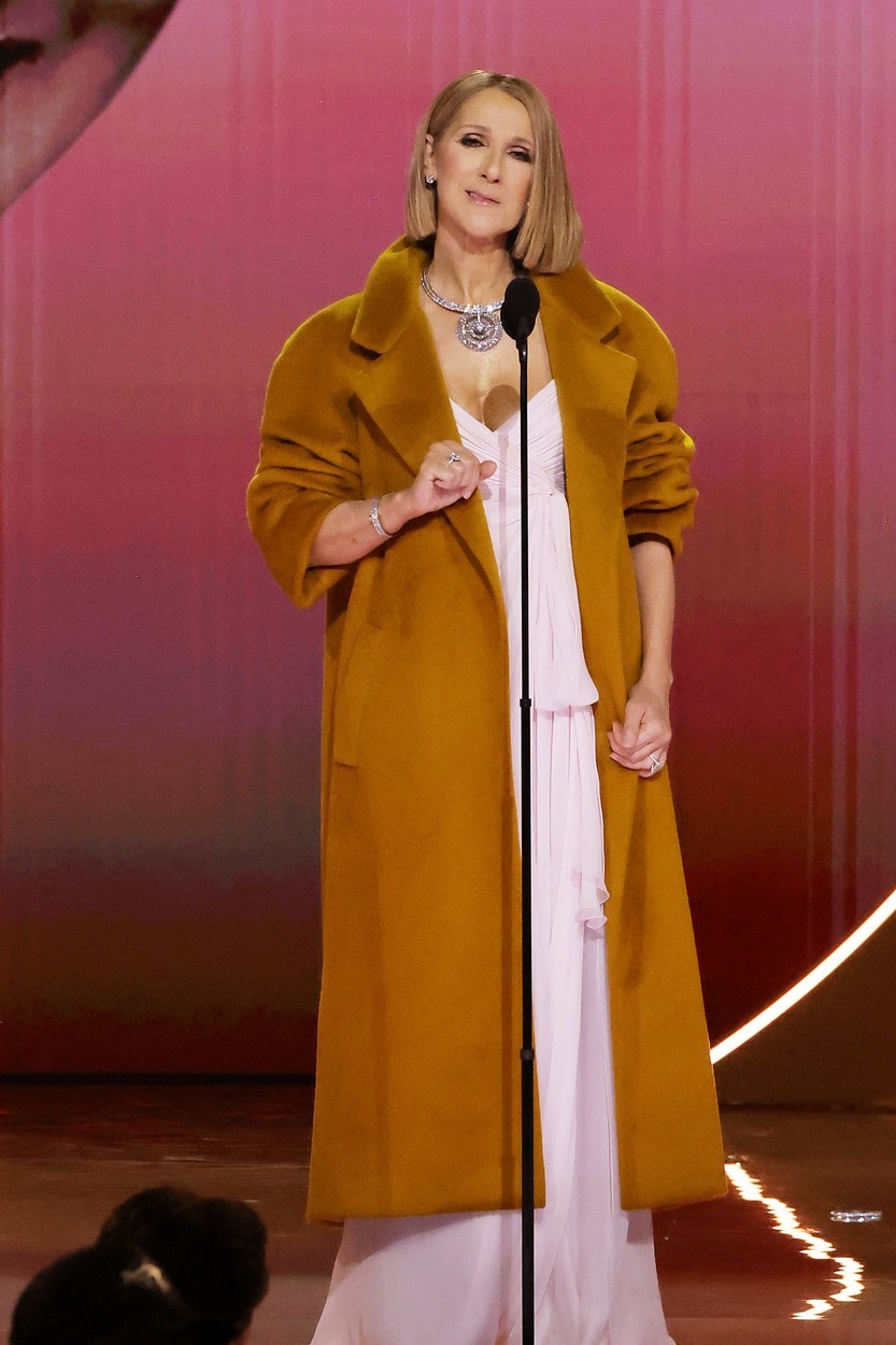 Céline Dion prišla v štýlovom horčicovo žltom kabátiku z dielne Valentino a pod ním mala svetlo ružové šaty s vysokým rázporkom. Najkrajšou ozdobou bol však jej úsmev a krásne slová, ktoré rozcítili snáď úplne všetkých...
