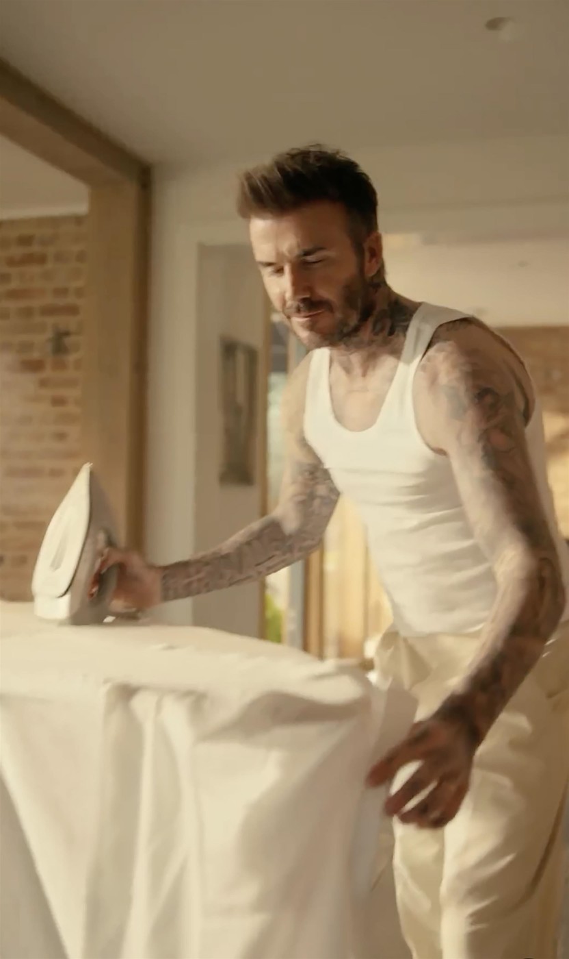 Hoci ide o reklamu a v reálnom živote si David určite košele nežehlí, najmä na ženské fanúšičky to zaúčinkovalo na sto percent, podobne, ako keď jeho manželka Victoria ukázala, ako polonahý opravuje televízor.