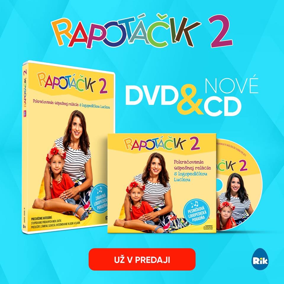 Skvelou pomôckou na precvičovanie reči vašich detičiek je aj druhé CD aj DVD Rapotáčik. Logopedička Lucka a malá Tete si spolu s vašimi detičkami precvičia slovnú zásobu, slabiky, zámená, slovesá či datív. Súčasťou každej epizódy je veselá logopedická pesnička.